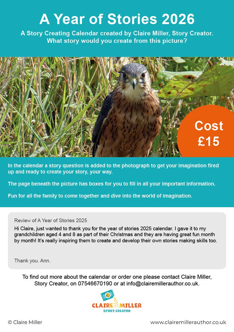 In the calendar a story question is added to the photograph to get your imagination fired up and ready to create your story, your way. The page beneath the picture has boxes for you to fill in all your important information. Fun for all the family to come together and dive into the world of imagination. Please contact Claire if you want to know more information or to find out how to buy a calendar.